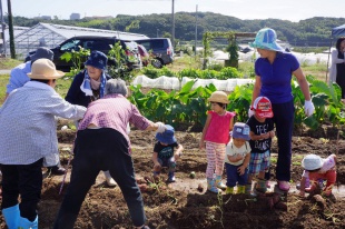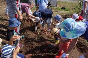 日ごろの行いが良かったのでしょう、当日は少し暑いくらいで天気に恵まれました。そんな陽気のなか、弊社託児所「たっち」の子供たちやリハリビング神戸西の入居者様、地域の方やボランティアの方などのご参加のもと、たくさんのサツマイモを収穫できました。子供たちに大きいサツマイモを掘ってもらおうと、あちこちで「ここ堀りー」「こっちの方が大きいでー」などの声があがり、どっさりとまさに芋づる式にサツマイモが出てくると「おおーっ!!」と歓声があがり、世代を超えた交流イベントとなりました。