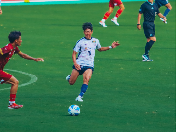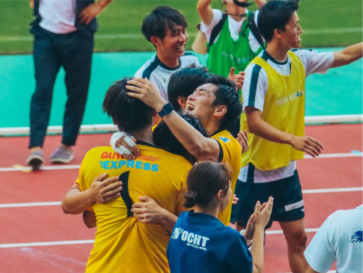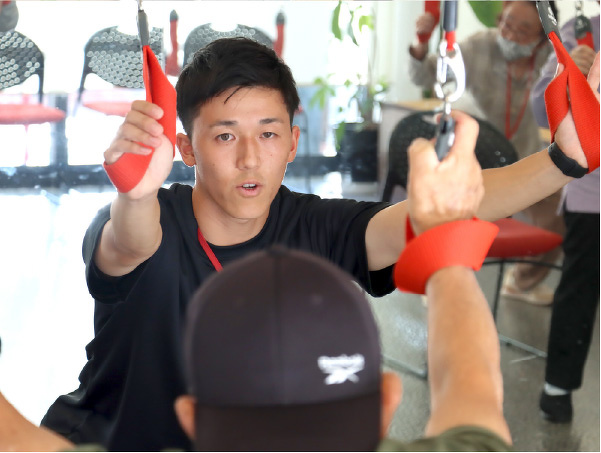 リハ・リハ グループには、Jリーグを目指すサッカー選手が所属しております。 平日の日中は、当社のデイサービスで運動指導や専門的なサポート業務を行い利用者様たちと交流を深め、業務終了後の夜間に練習、休日には試合や大会に出場し、当社での勤務と両立しながら多忙な選手生活を送っています。