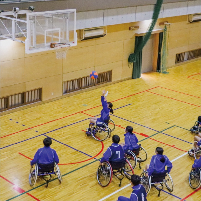 福祉教育の一環として、幅広い学生へ向けて「車いすバスケットボール体験」を通じた特別授業を行う活動をしています。 授業内容は、日常生活用と競技用それぞれの車いすの違いの紹介から、学生の皆さまが実際に車いすに乗って前方・後方へ進む動作やボールを運びながらの動作の体験、そしてクラス毎に分かれてバスケの試合などを行います。 リハ・リハ グループとして地域と積極的に関わり、より包括的で理解ある社会を築いていくための活動として取り組んでいます。