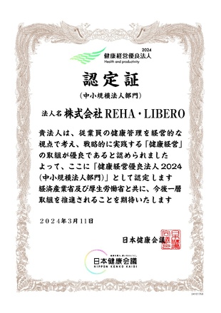 経済産業省と日本健康会議が共同で実施する『健康経営優良法人2024』 に株式会社セラピット・株式会社REHA・LIBEROが6年連続で認定され、株式会社Clover Kitchenも昨年に引き続き4連続で認定されました。