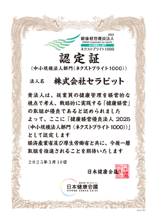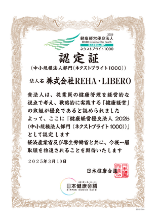 経済産業省と日本健康会議が共同で実施する『健康経営優良法人2025』 に株式会社セラピット・株式会社REHA・LIBEROが7年連続で認定され、株式会社Clover Kitchenも昨年に引き続き5連続で認定されたことをお知らせします。 株式会社セラピットと株式会社REHA・LIBEROは「中小規模法人部門」の19,796法人中、上位501~1500位法人に認定させる「ネクストブライト1000」の冠をいただきました。 今後も健康経営を推進し、従業員が健やかに働ける企業を目指していきます。