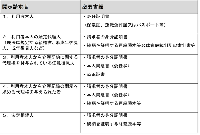 また、受付の際に、書面による介護情報の提供及び介護記録の開示の対象者であることを確認させていただくため、本書面記載の必要書類をお持ちください。
