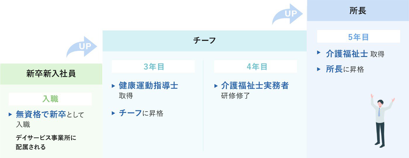 3年目以降資格の取得と共に現場を束ねるチーフとなり、現在は事業所の責任者として経営視点で組織運営に関する業務を担う。