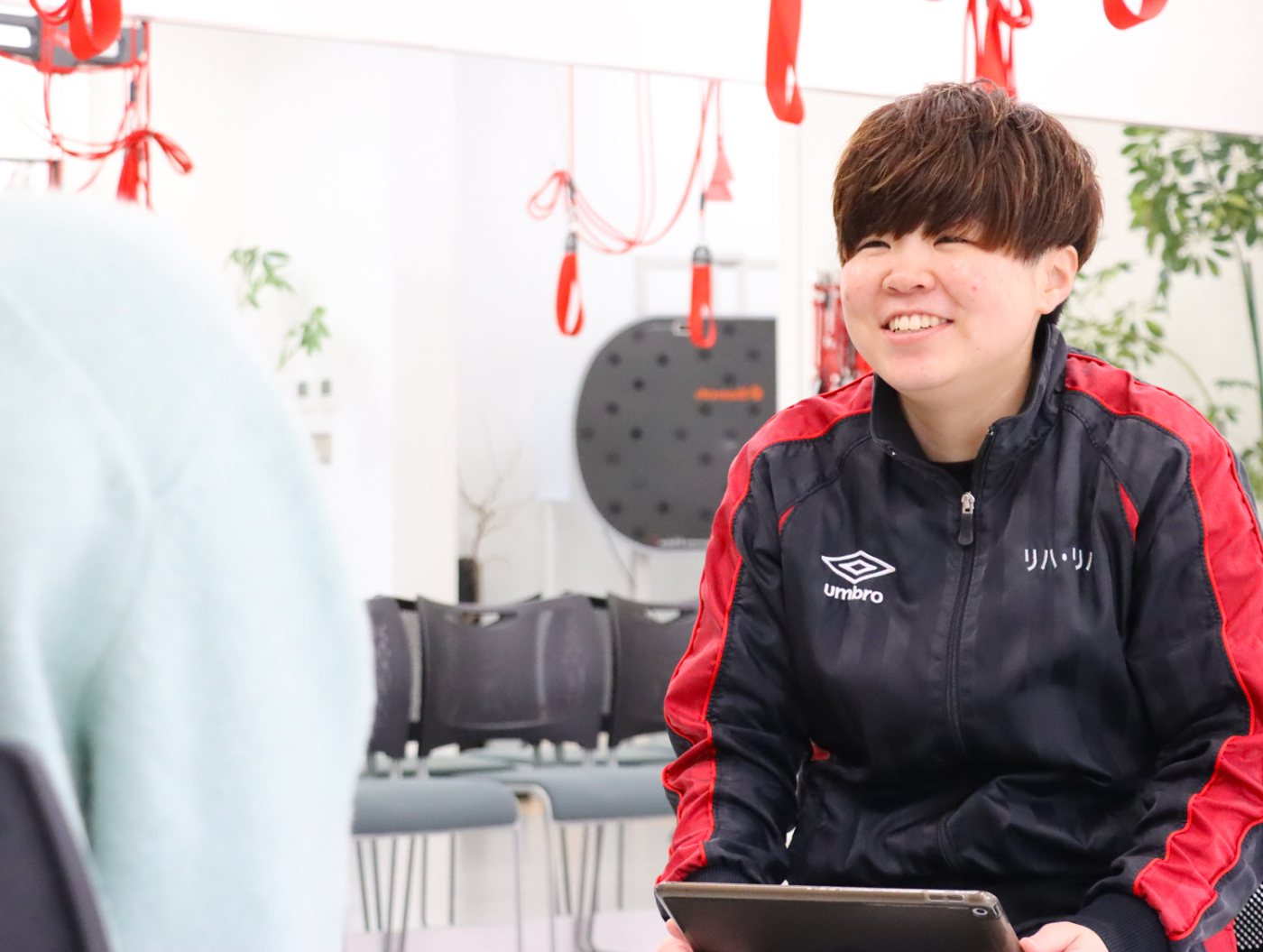 私は大学で発達教育や福祉臨床について学び、その中でも地域包括ケアや回復期リハビリテーションに興味を持ちました。実習で地域包括ケア病棟へ行き、それと似ているといわれる回復期リハビリテーション病棟との比較を行い、高齢化社会で2つの病棟の必要性を強く感じました。そんな時、リハ・リハのリハビリ特化型デイサービスの取り組みを知り、私もここで働きたいと思い入社を決意しました。