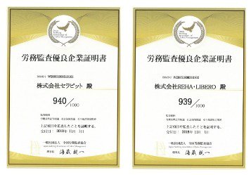 株式会社セラピットは1000点満点中940点、株式会社REHA・LIBEROは1000点満点中939点を獲得し、労務監査優良企業証明書をいただきました。