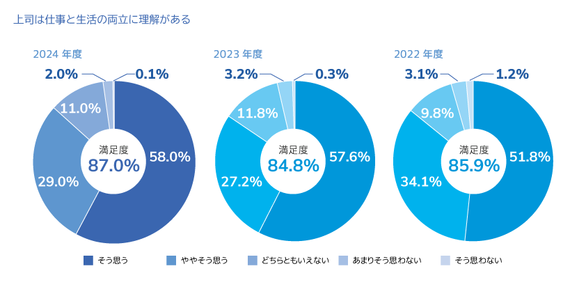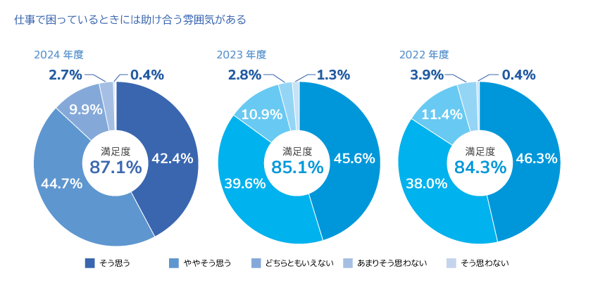 2024年実施のアンケート結果では、仕事と生活の両立に理解があること、上司・部下に関わらずスタッフ同士のコミュニケーションが円滑であること、職場内でお互い助け合いの雰囲気があることなどが良いデータとして挙げられます。
