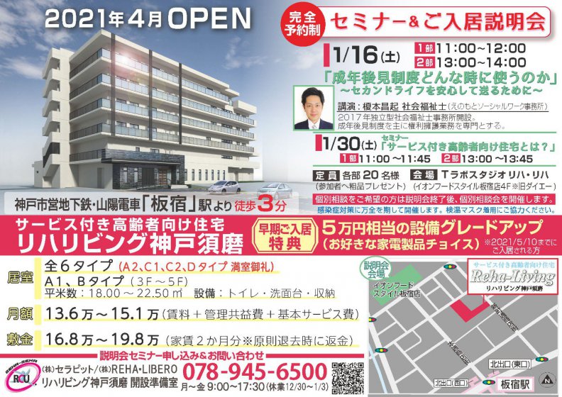 12月の説明会では多くの方にご来場いただきありがとうございます。 リハリビング神戸須磨オープンまで3か月となりました。 お部屋も全51室の内、半分以上に仮ご予約のお申込みを頂いております。 ご好評いただきましたリハリビング神戸須磨の説明会&セミナーを1月も開催する運びとなりました。 日程は1月16㈯、1月31日㈯となります。。 1月16日㈯は「えのもとソーシャルワーク事務所」より榎本昌起さんをお迎えし、特別セミナー「成年後見制度はどんな時に使うのか」をご講演いただきます。 成年後見制度とは?もしも、ご家族がおらず認知症になった時、お金の管理はどうしたらよいのか?成年後見制度とはどんな人が使うのか?等、わかりやすくご説明をしていただきます。 後半はリハリビング神戸須磨の説明会を行います。 入場前の検温や手指消毒、ソーシャルディスタンスの確保を行い、感染対策に十分留意し運営を致しますので、ご参加お待ちしております。 完全予約制となっておりますので、お電話またはホームページにてお申込みください。 お申込みフォーム