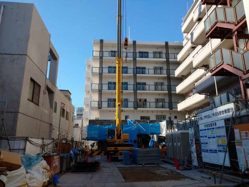 建設現場に伺うとブルーシートが取れて外観が見えるようになっていました!! 正面玄関がまだ隠れて見えませんでしたが、真新しい壁が青空に映えています。 これから徐々に全貌が明らかになってきます!